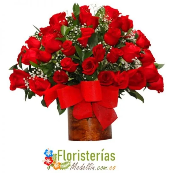 Demuestra todo tu amor con este hermoso arreglo de 50 rosas adornadas con finos follajes en una base artesanal.“Tarjeta y envió incluido”