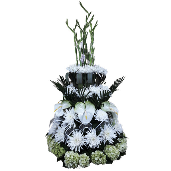 Clemón, Anturios, Hortensias, Palmitas, Hojas de lino, Gladiolos, helecho cuero.