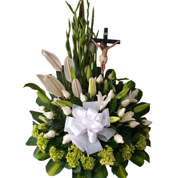 Arreglo floral fúnebre elaborado en variedad de flor blanca.