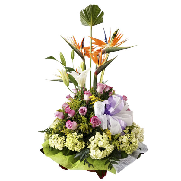 Rosas moradas, aves del paraíso, hoja de iraca, lirios, hortensias, solidago, helecho cuero, hojas de lino y hojas de carey