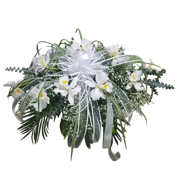 Orquideas, Gipso, Eucalipto, Helecho cuero, Palmitas, Hojas de lino, Hojas de cinta.