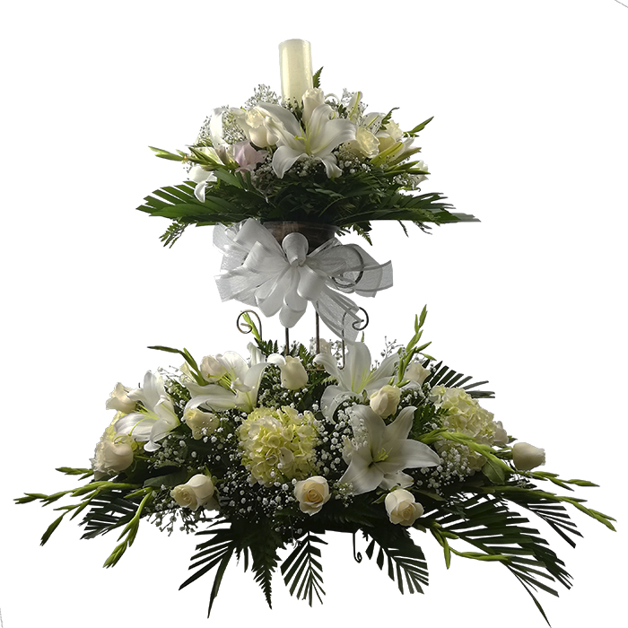 Hermoso arreglo fúnebre acompañado de un Cristo.
