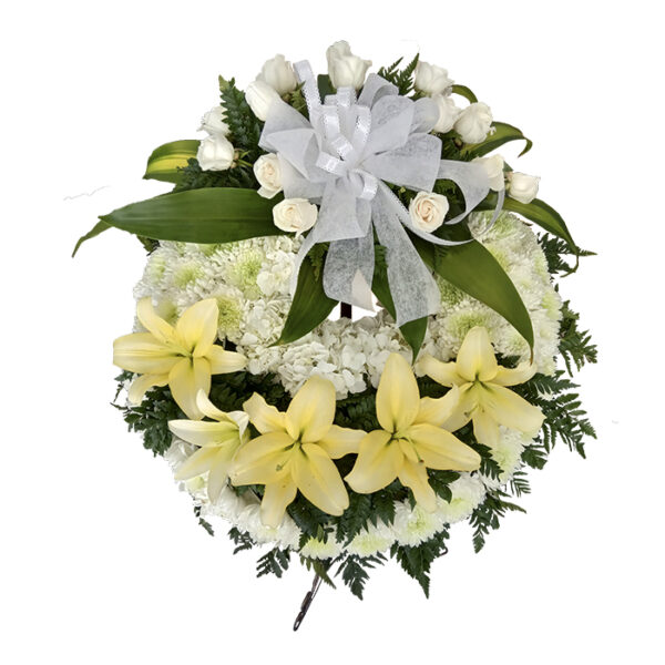 Eleva tu homenaje con nuestra Corona Fúnebre Santa Divinidad: una exquisita combinación de flores blancas que honra con elegancia y serenidad.